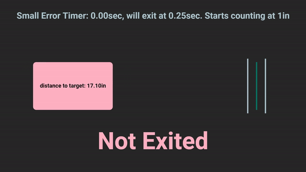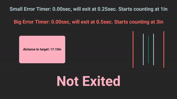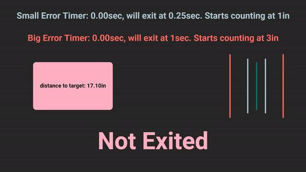 But when the robot enters the smaller exit zone, the big timer will not continue. If the big timer was not reset to 0 and we overshot target, big timer would be starting from a very high number and we would exit before correctly confirming the robot has settled. This can be seen here.